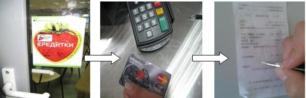 2.  Предоставляете кассиру свою кредитку для оплаты товара